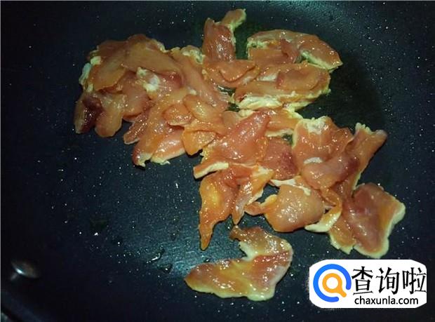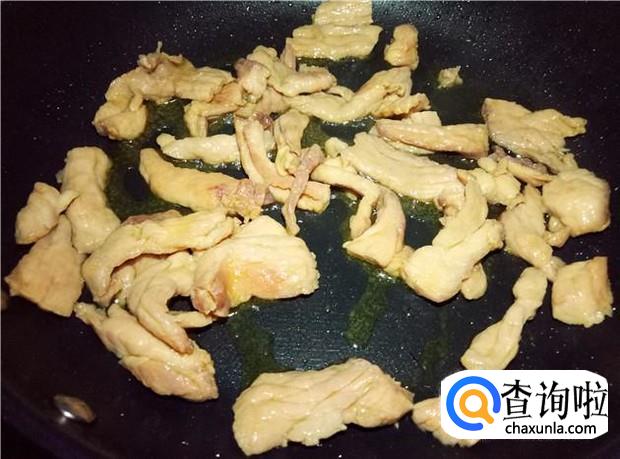 锅里下少许花生油,放入腌制好的瘦肉,先把瘦肉炒熟。