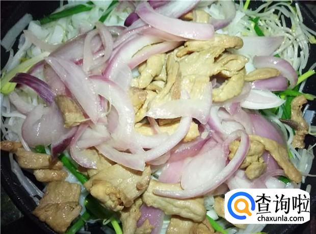 把河粉炒软后,再把洋葱和瘦肉一起倒下去,用小火,慢慢翻炒均匀。