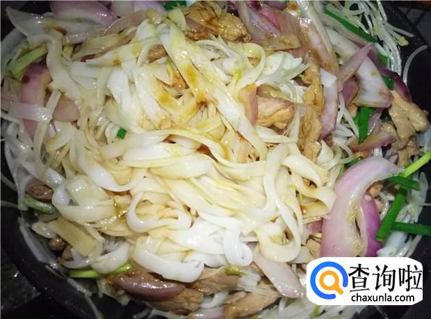 锅里再倒入花生油,把河粉倒下去,用筷子把河粉给打散均匀。