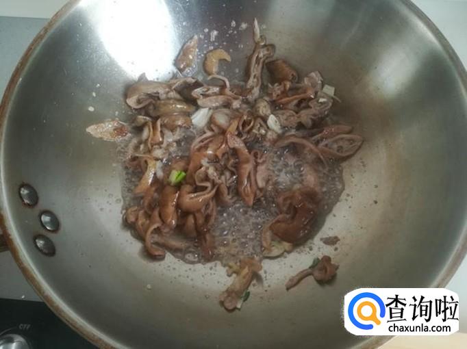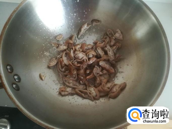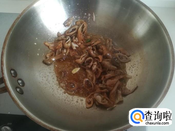取一炒锅放火上,把肥肠入锅慢慢煸出肥油。