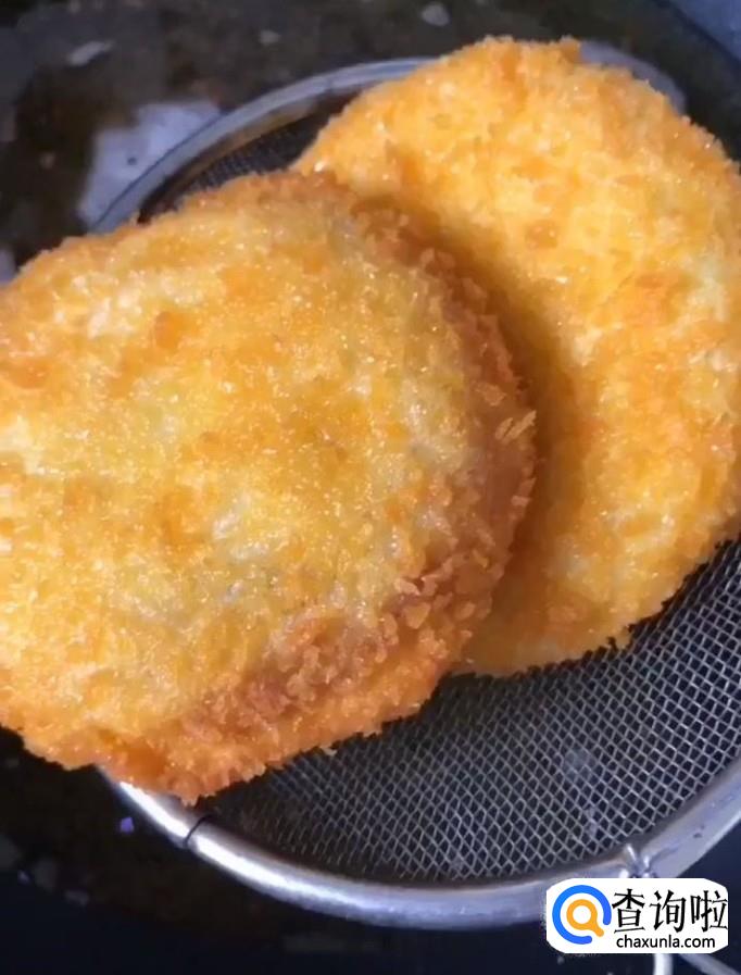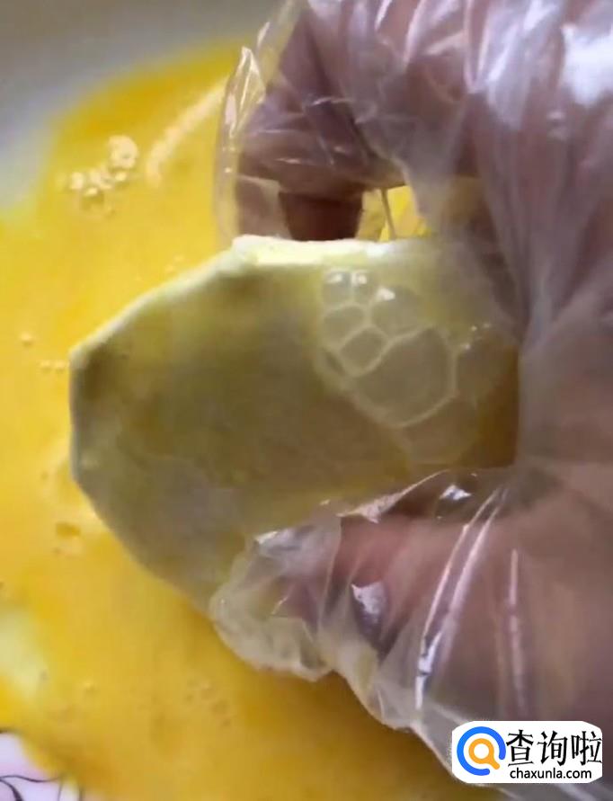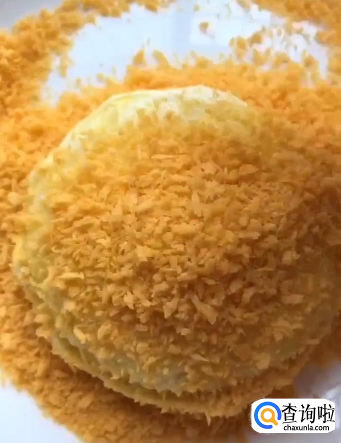 然后我们将压好的吐司面包裹上一层鸡蛋液,再裹上一面包糠