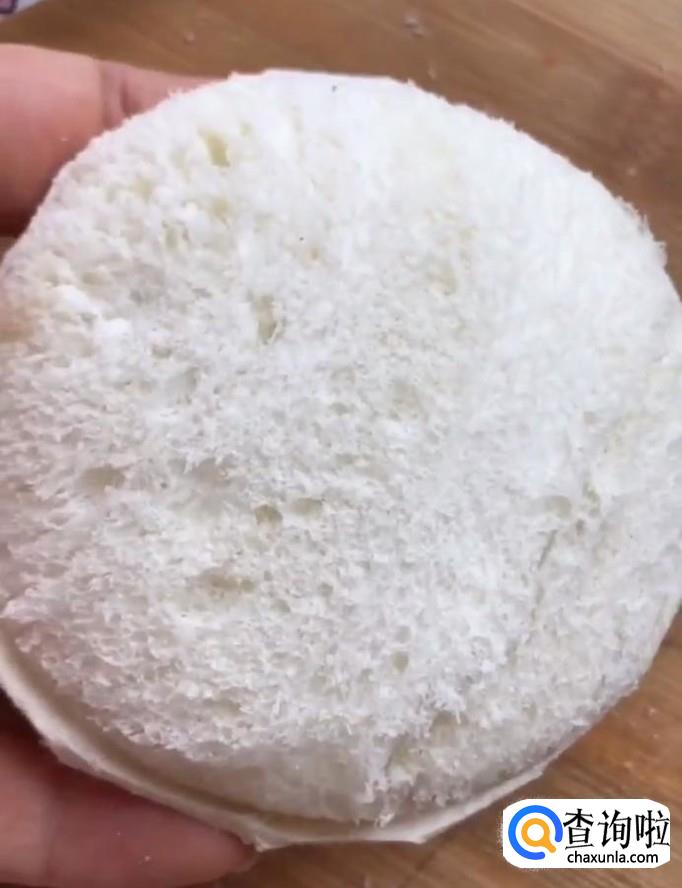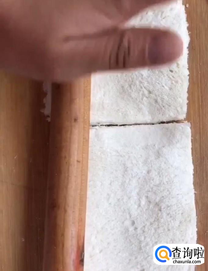 首先我们将吐司面包的周边切掉,用擀面杖擀一下,压实
