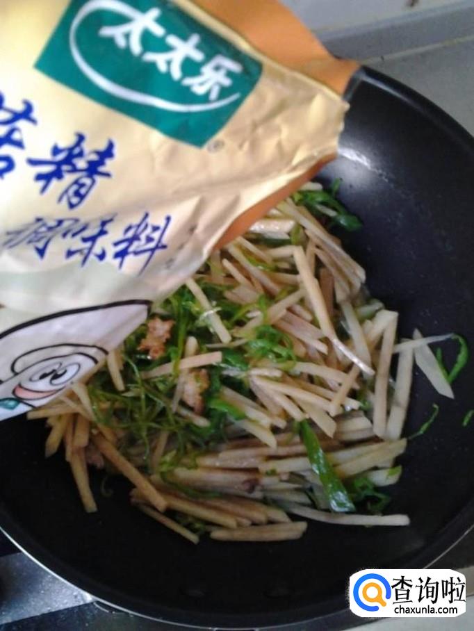 最后葱姜蒜爆香,依次加入土豆丝、青椒后不断翻炒,加入各种调味品,半碗水闷一下就可以出锅了。