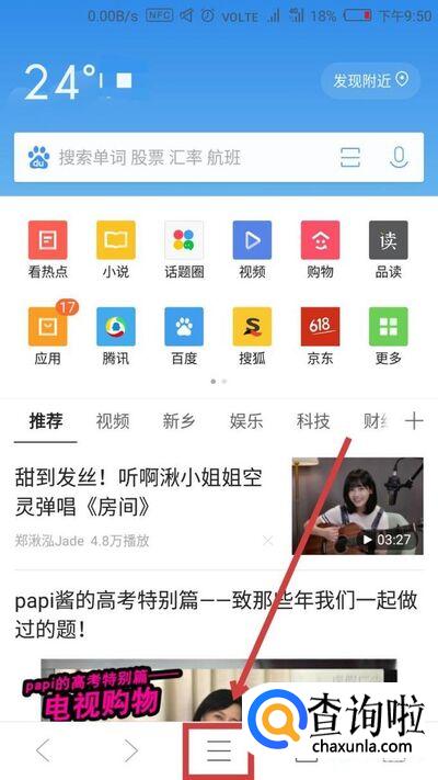 打开QQ浏览器,在界面下方找到三条杠,点击进入。