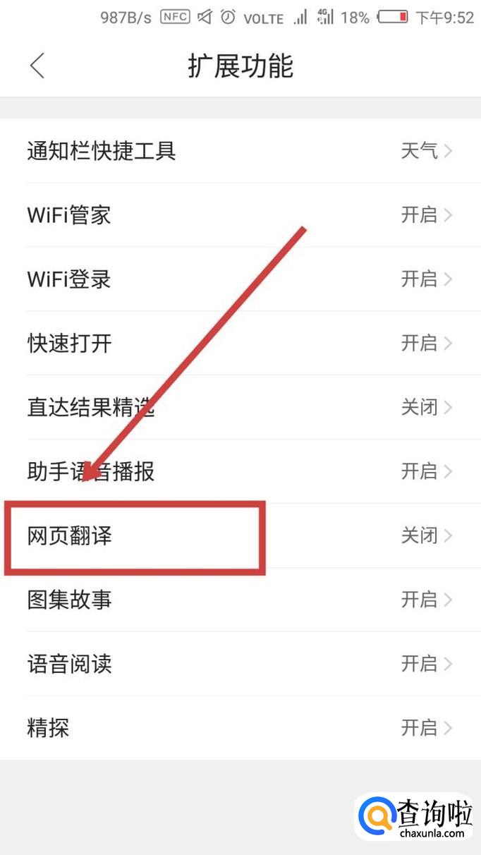 然后在“扩展功能”中找到“网页翻译”,点击进入。