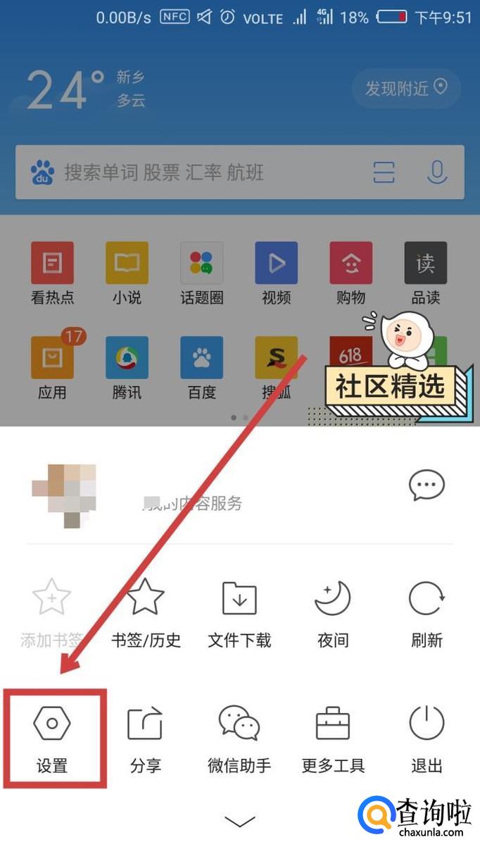 然后在底部弹出的选项卡中找到“设置”,点击进入。