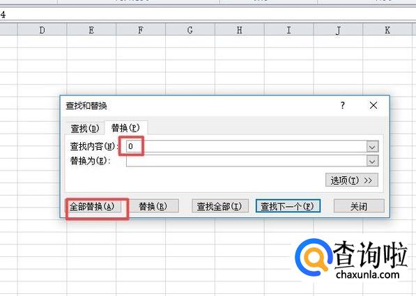 然后我们在查找内容中输入0,之后我们点击全部替换;