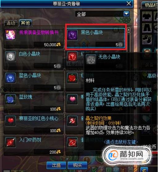 在赛丽亚的商店中,可以通过消耗5个无色小晶块来购买1个黑色小晶块。