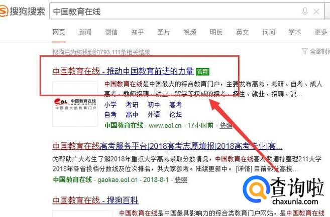进入之后,搜索“中国教育在线”,点击搜索结果并进入,如图所示。