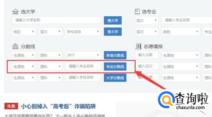 进入之后,找到“分数线”,然后将“生源地、文理科、专业名称”设置好之后,点击“专业分数线”即可查询,如图所示。