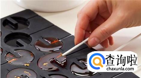 将水果浓汁倒进早就准备好的水果糖模具中,再把糖浆倒进去,放一根棒棒糖的棒棒。