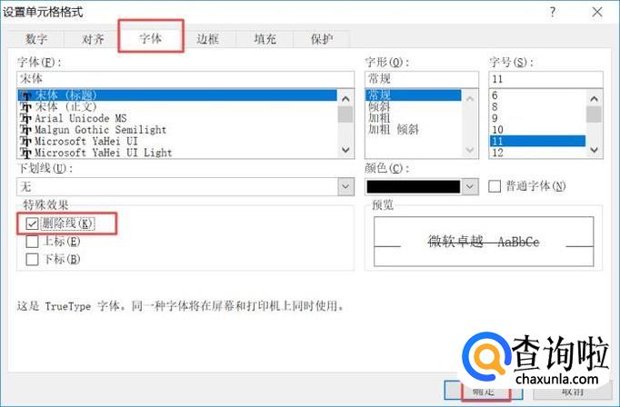 弹出的界面,我们点击文字,然后我们将删除线勾选上,之后我们点击确定;