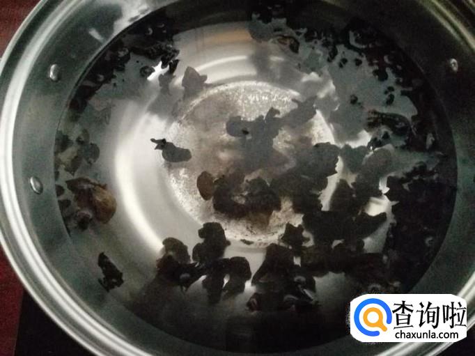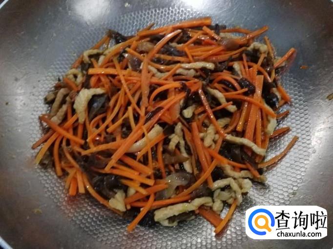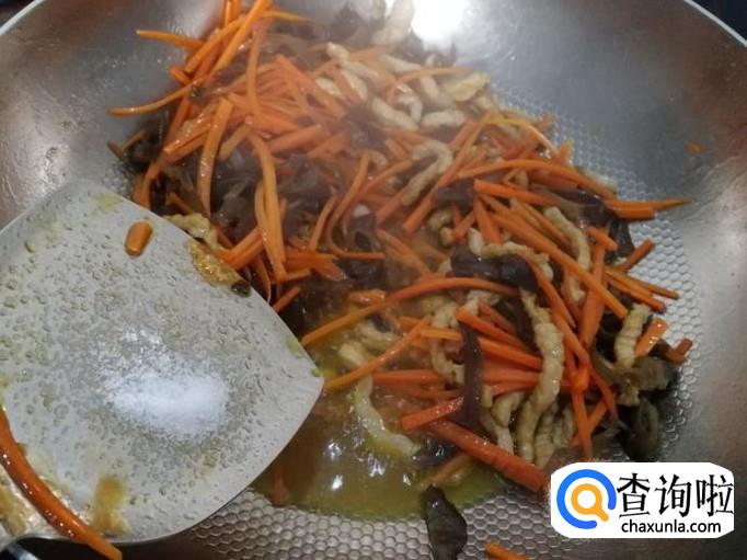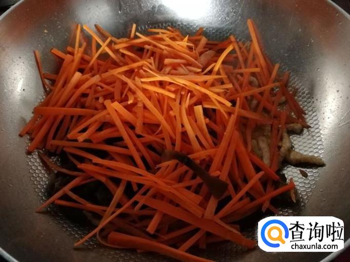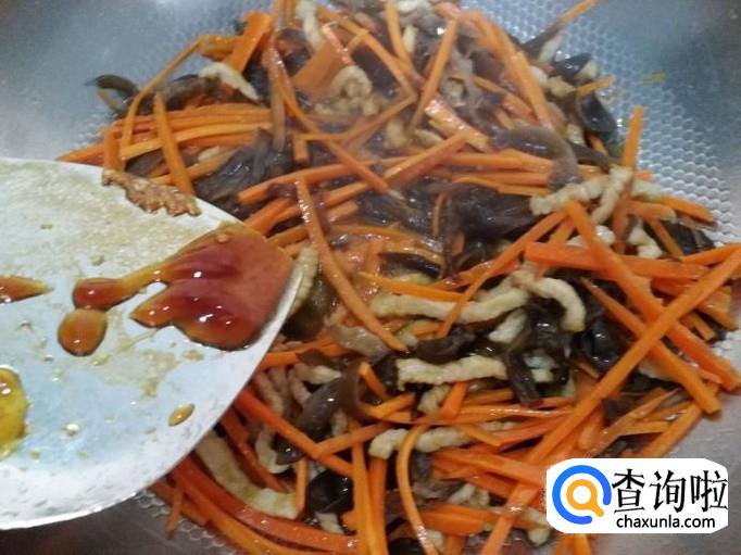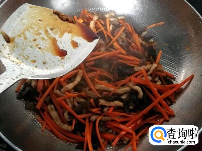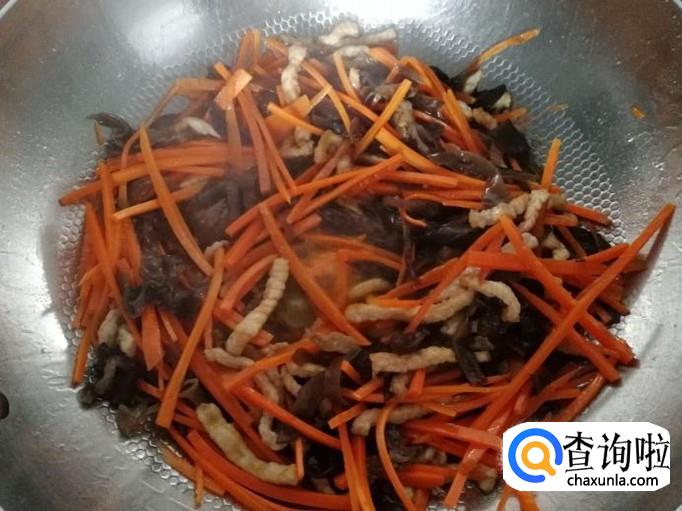 下胡萝卜丝、木耳丝翻炒均匀后,加适量水焖煮。