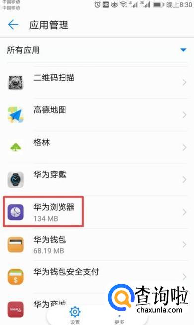 进入应用管理后,我们下拉界面,找到华为浏览器,然后点击打开它;