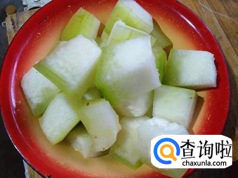 切好葱姜以后,接着把冬瓜去皮切成块。