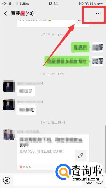 进入后,在群聊天页面的右上角有个符号,如下图,点击进入。