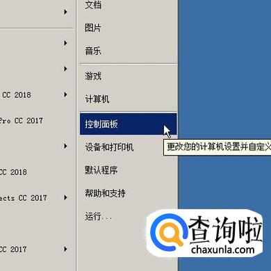 在电脑桌面左下角点击开始按钮,弹出的面板中再点:控制面板