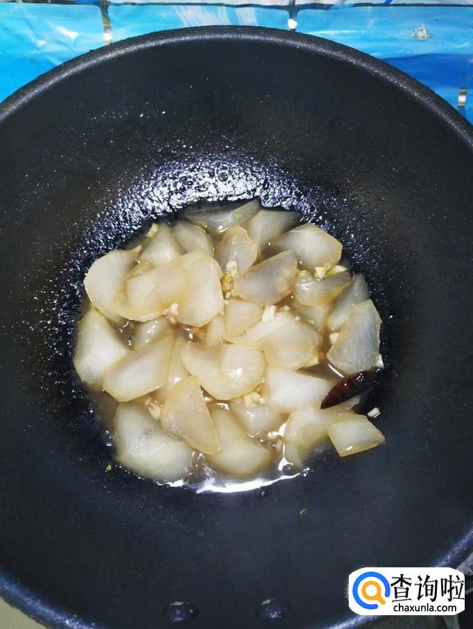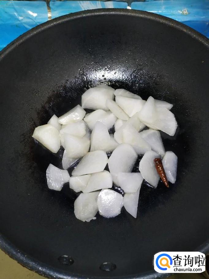炒锅中放适量油,然后放入一个干辣椒炒香,将白萝卜块儿,倒入锅中,翻炒均匀。