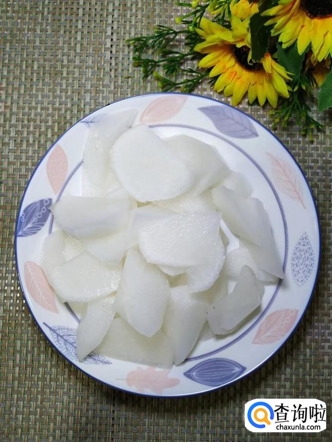 准备一个大白萝卜,洗净后去皮,切成滚刀块,放入盘中备用。