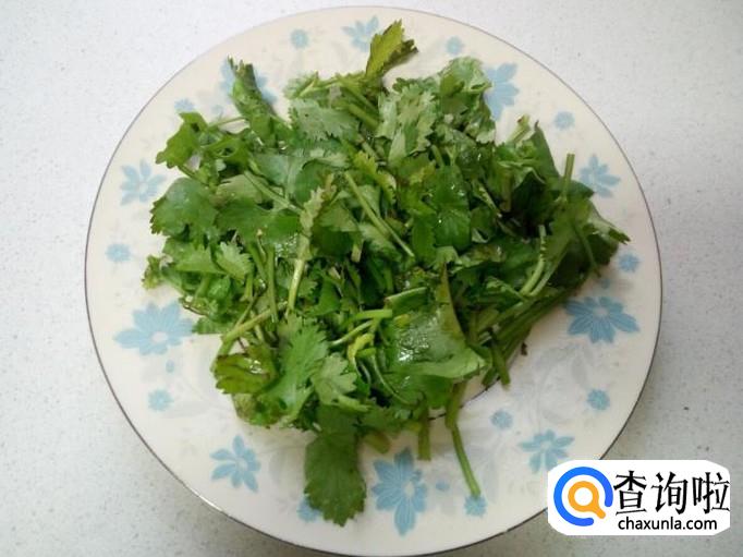 香菜收拾清洗干净,控干水分,切成段。胡萝卜去皮,用水清洗干净,切成丝。