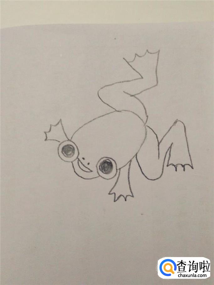 在青蛙的身体后方,画出两条后腿,每条后腿分成三段,先画两条胖胖的和屁股相连的大腿,中间一段要画细些,末端是脚趾连在一起的蹼。