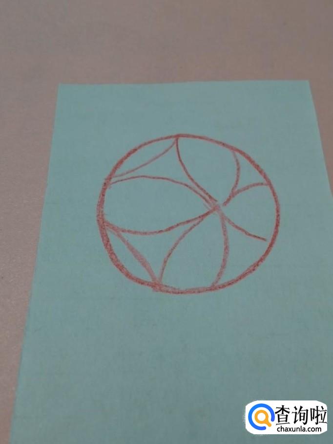 在绣球右侧,画四片花瓣,组成一朵花,在左边画两条弧线,表示后面的花瓣。这是绣球特有的图案。