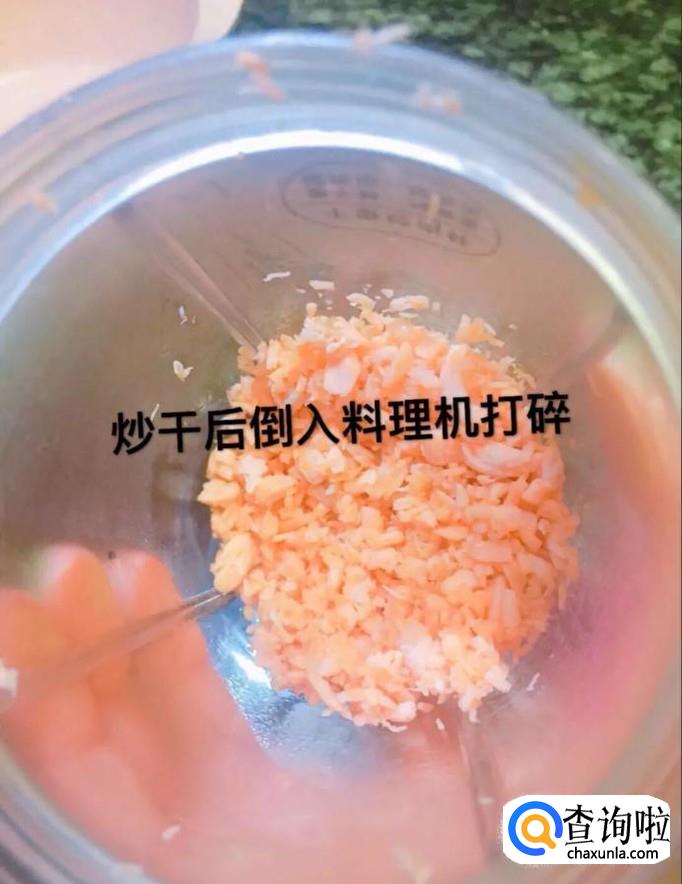 然后将炒干的三文鱼倒入料理机中打碎,如下图所示。