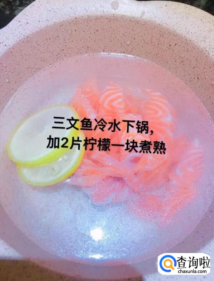 接着将三文鱼冷水下锅,加入两片的柠檬片一块煮熟,如下图所示。