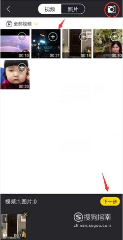 在视频导入页面,导入需要添加滤镜的视频进行编辑,可点击视频中的“+”导入。也可以点击右上角的“相机”图标现场拍摄。添加成功后点击“下一步”。