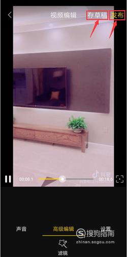 返回视频编辑页面后,点击“存草稿”将制作完成的视频保存到我的作品当中,点击“发布”快速分享给好友。
