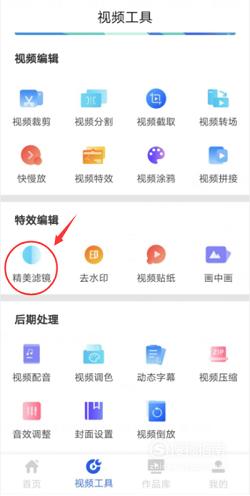 在视频工具页面中的特效编辑模块,找到“精美滤镜”功能。点击进入视频导入页面。
