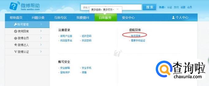 在【微博帮助】页面中点击上方的【自助服务】,如下图所示: