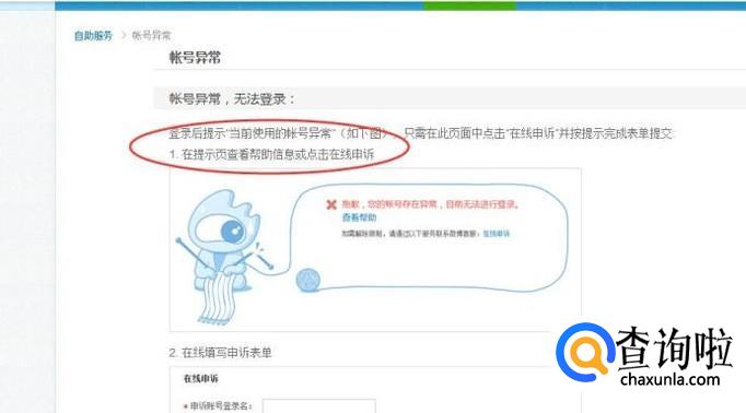 如果是账号异常的话,则点击【登陆异常】下方的【账号异常】链接,然后按照要求进行申诉即可,如下图所示: