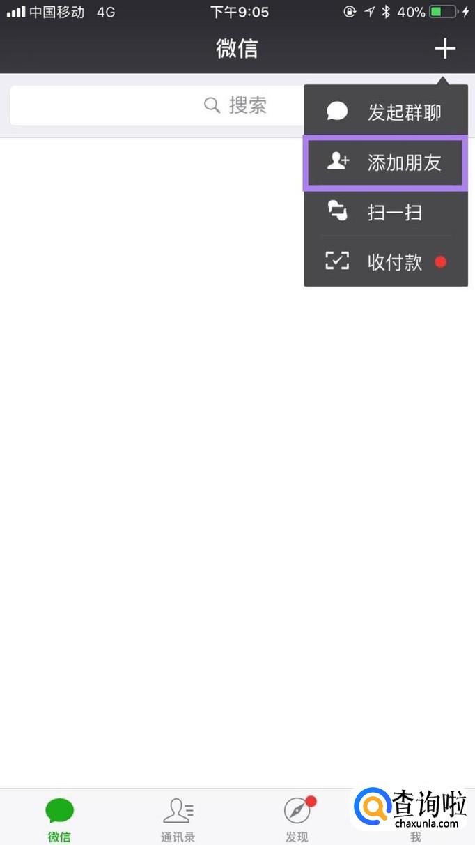 然后点击屏幕右上方的“+”并点击添加朋友,如下图所示。