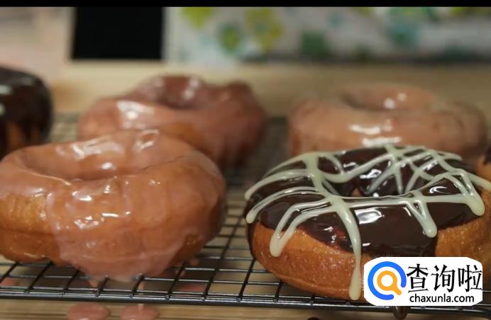 甜甜圈放入八成热的油锅炸至两面金黄色即可出锅,沾上巧克力酱就完成了。