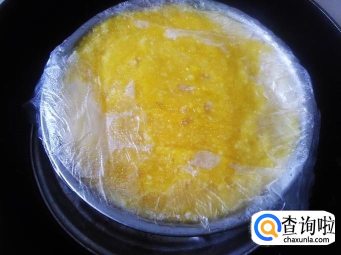 然后把搅拌好的糯米糊倒进去,用保鲜膜盖上。