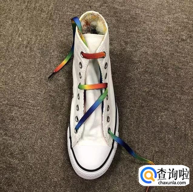 鞋带从中间穿过后在最上面的横杠鞋带上绕一下;