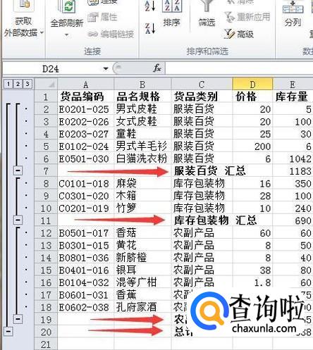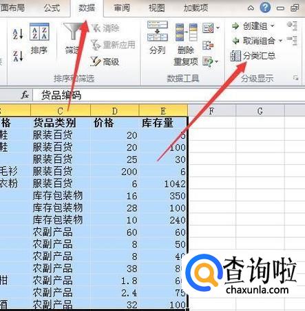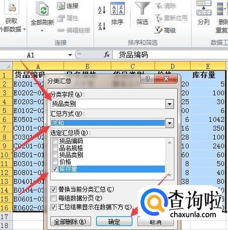 在对话框中选择分类字段(即分类的依据),再选择汇总方式如求和,再勾选汇总项,如库存量。最后按确定。