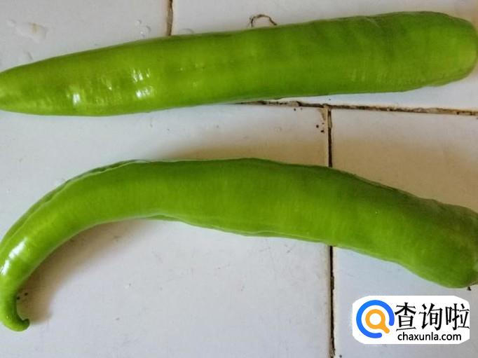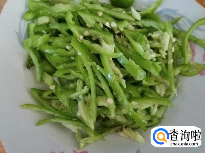 今天我们选用两个新鲜的青辣椒,这个辣椒有些微辣,先把辣椒用清水洗净,然后放在菜板上,用刀背把辣椒拍扁,最后切成细丝待用。