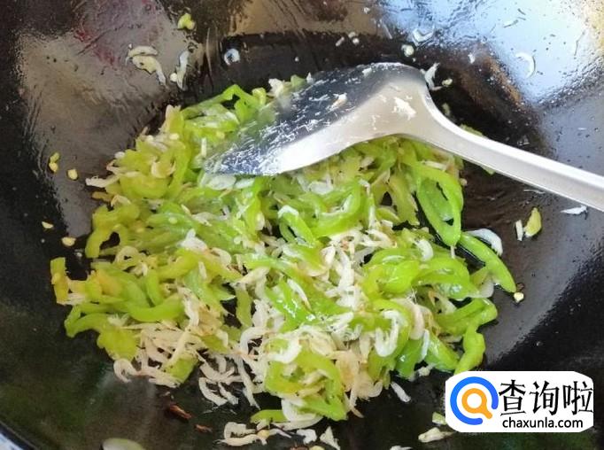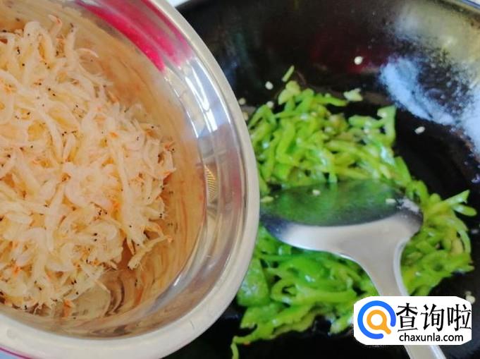 然后就可以加入我们备好的虾皮,继续翻炒均匀,然后加入适量盐继续翻炒,注意勤翻炒,不要炒糊了。