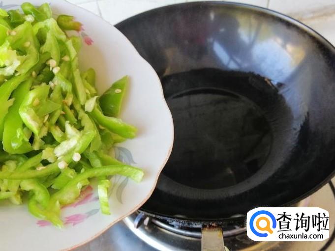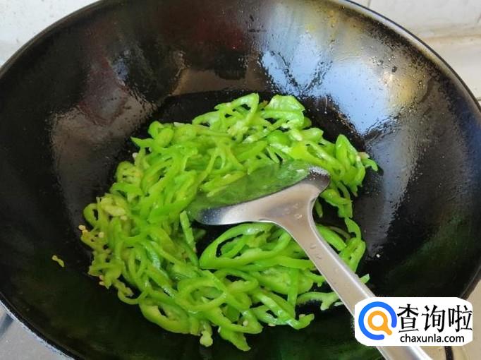 炒锅放油,油热以后我们就可以倒入切好的辣椒丝,用铲子把辣椒丝翻炒均匀,油比平时要多放些。