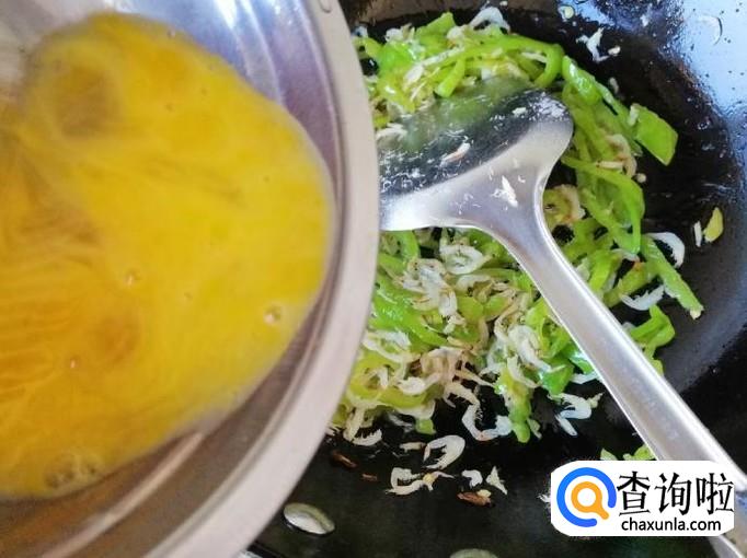 最后要加入的就是备好的蛋液,把蛋液顺着锅边倒一圈,让蛋液和辣椒虾皮充分融合在一起,待蛋液凝固后翻炒均匀,这样我们的辣椒鸡蛋炒虾皮就完成了。