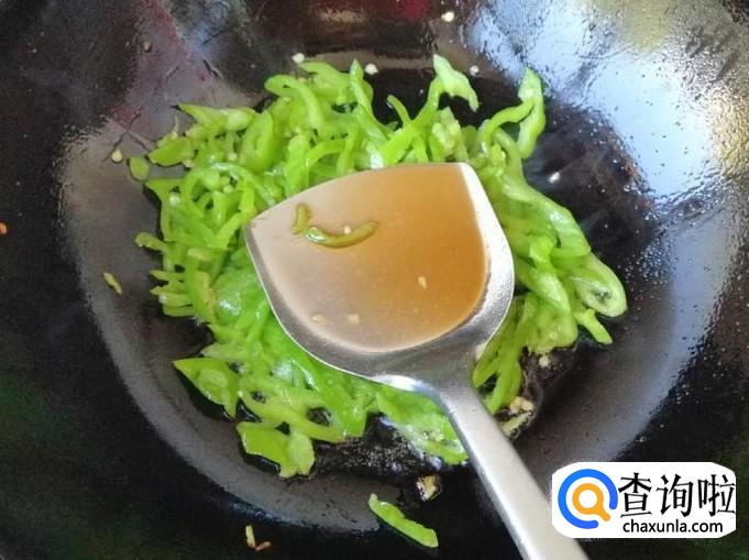 等待辣椒丝炒的快要变软的时候,我们可以加入一铲子香醋,加香醋主要是为了去掉一些辣味,加好醋后翻炒片刻。