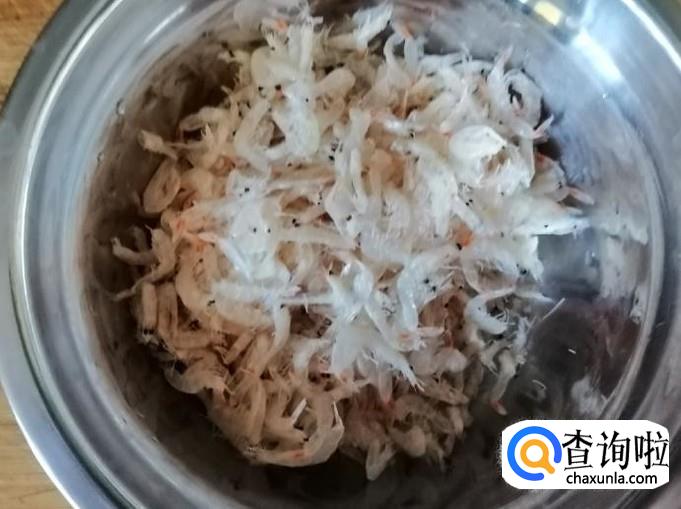 选用适量的虾皮,用清水洗净待用。我这里选择的虾皮是包装好的免洗鲜虾皮,这种虾皮盐味很淡,所以用水冲一下就可以,要是很咸的虾皮就得多泡会。