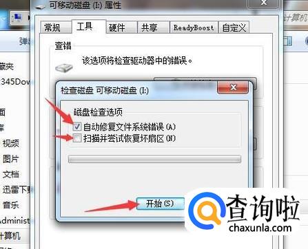 勾选两个检查选项,点击开始进行检查修复磁盘。修复后文档可能就能打开了。