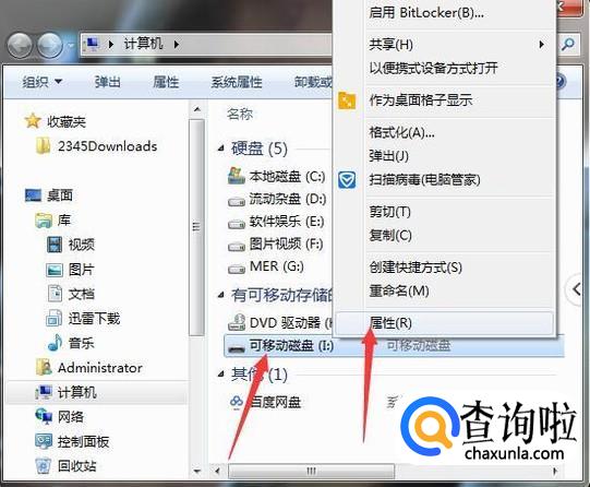 第二种方法,可能磁盘有错误,右击可移动磁盘,选择属性。