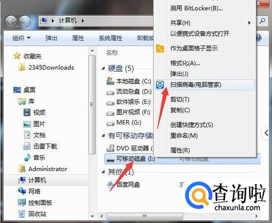 首先,看看是不是中毒了,打开计算机,右击可移动磁盘。点击扫描病毒。要先有安装杀毒软件在电脑里。