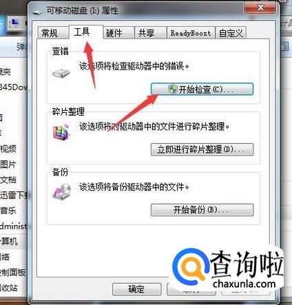 弹出可移动磁盘属性,点击工具选项卡,点击开始检查。
