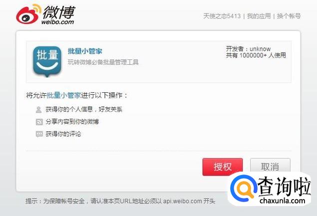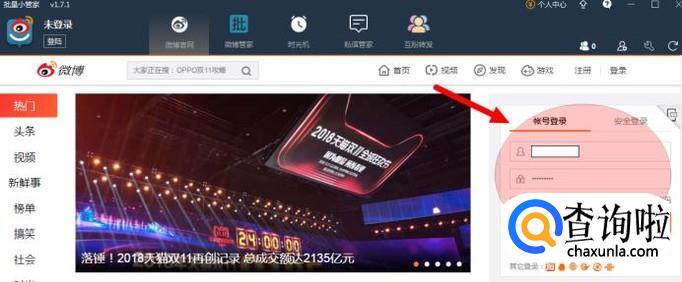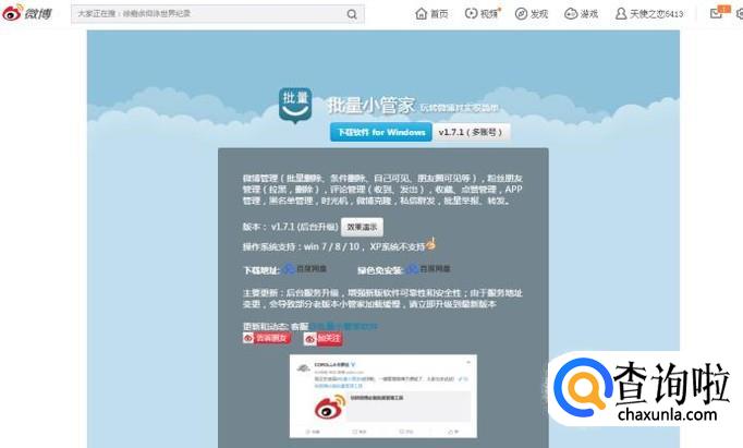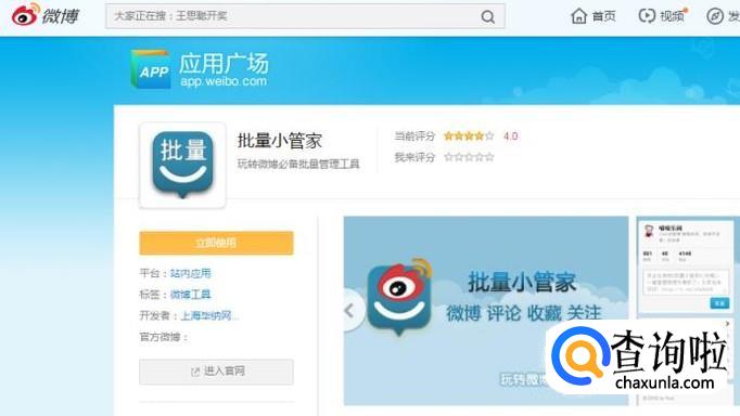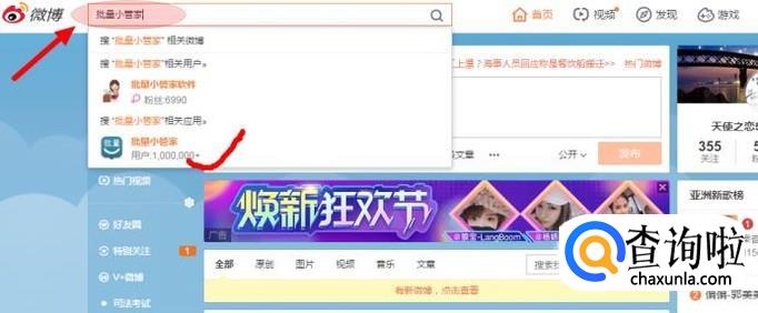 登陆新浪微博,在主界面搜索框里搜索“批量小管家”。