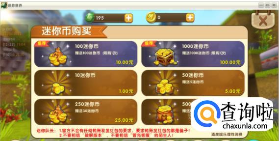 进来之后你就可以看到迷你币的购买规则。这里要注意迷你币的购买是要花钱的。这不是用迷你豆兑换的,迷你币可以换迷你豆,但是迷你豆不能换迷你币,别搞错了。